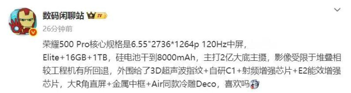 博主 @数码闲聊站 曝光了荣耀 500 Pro 手机的核心规格:新机采用大 R 角直屏+金属中框 +Air 同款冷雕 Deco,配备6.55 英寸2736×1264p 120Hz中屏,搭载骁龙 8 至尊版处理器,提供16GB+1TB存储可选,内置8000mAh硅电池,主打2亿大底主摄,支持3D 超声波指纹 + 自研 C1+ 射频增强芯片 +E2 能效增强芯片。