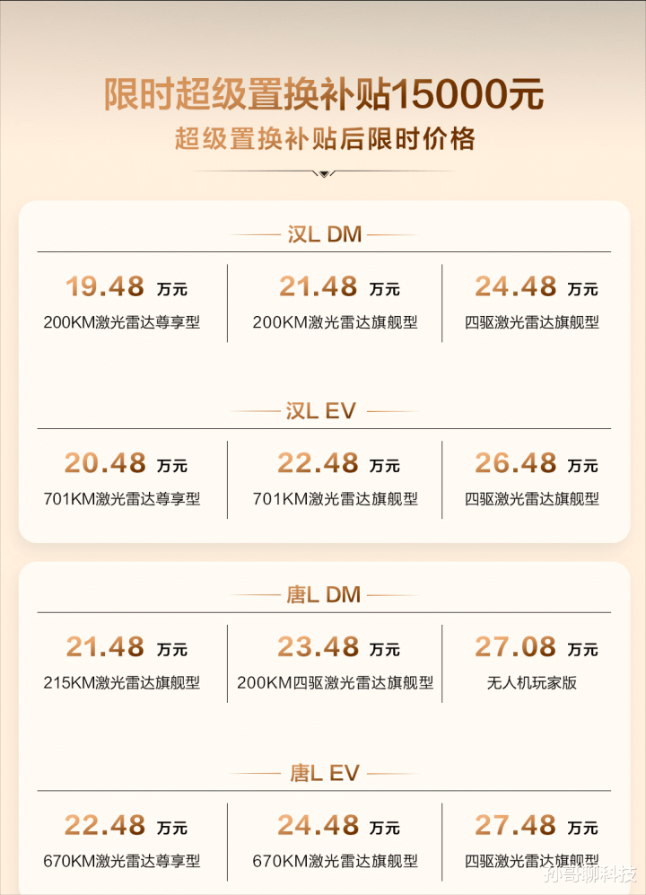 最后是价格方面,汉L EV超级置换补贴售价让三款车型在20.48万至26.48万之间起售、汉L DM三款车型售价在19.48万至24.48万起售。唐L EV超级置换补贴让三款车型售价在22.48万至27.48万起售、唐L DM三款车型售价在21.48万至27.08万元起售。12月31日之前最高还有至高5万元的尊享礼遇,汉L原价13000元外观套装现在只要3000元、唐L原价1万元权益现在只要3000元,同样定在12月31日前结束。
