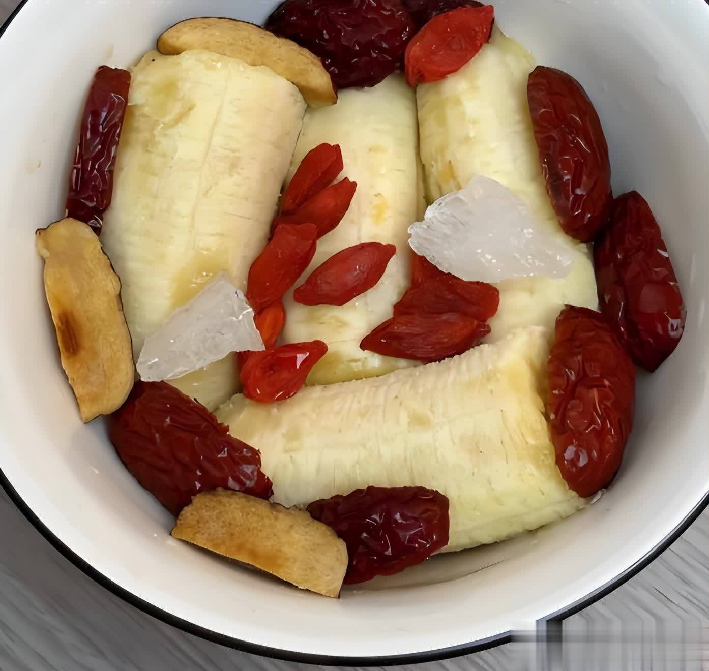 1. 准备食材:首先将红枣、枸杞、香蕉洗净。红枣可以去核后切成小块,枸杞用清水冲洗干净。香蕉剥皮,切成小段备用。